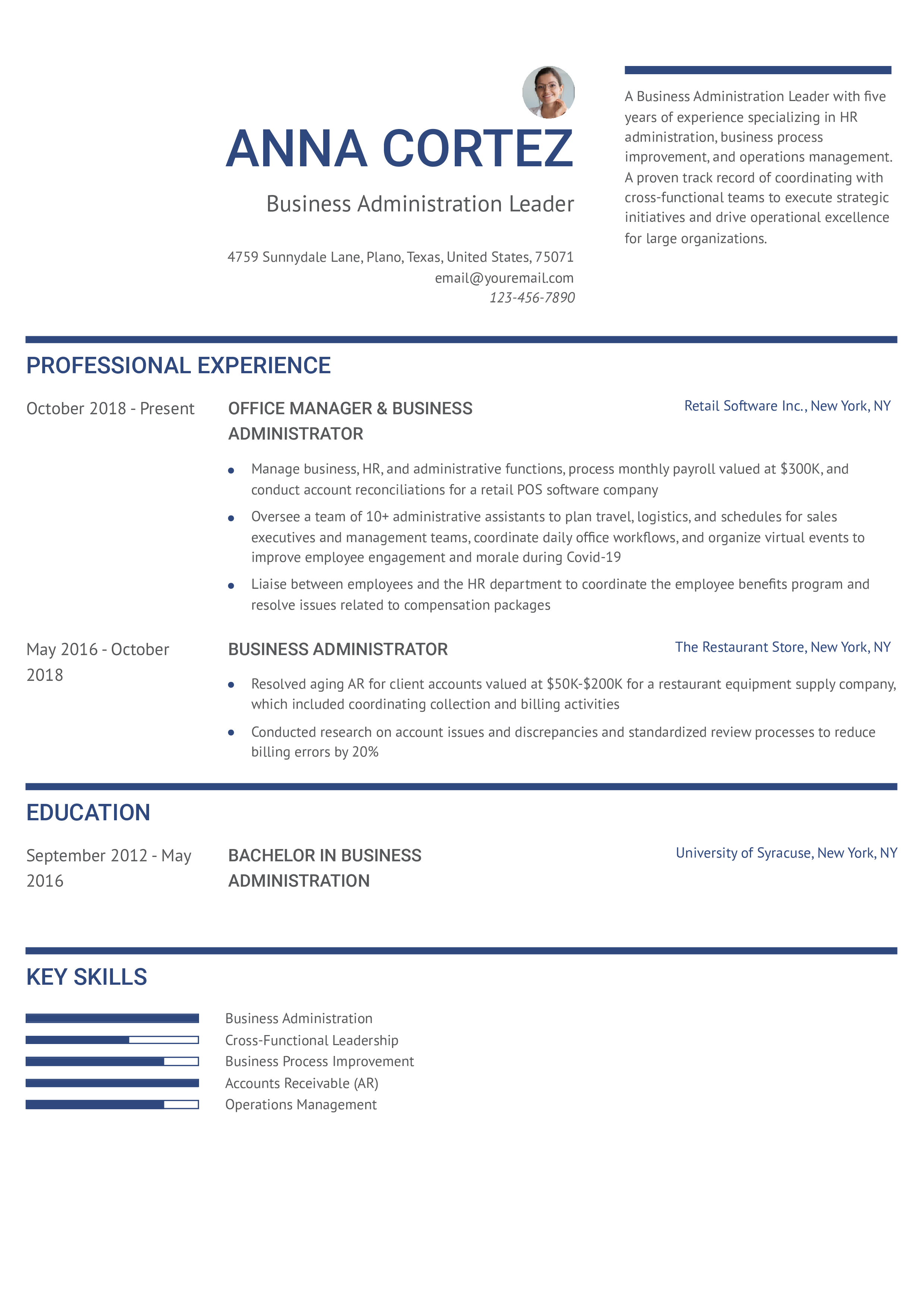 Following your work history, the Education section should list your degrees, certifications, and any relevant coursework. Business administration often benefits from a strong educational background, so highlight your academic achievements. Lastly, a dedicated Skills section is indispensable. Divide your skills into categories like "Technical Skills" and "Soft Skills." This allows you to showcase a broad range of capabilities pertinent to business administration, from software proficiency to interpersonal communication.