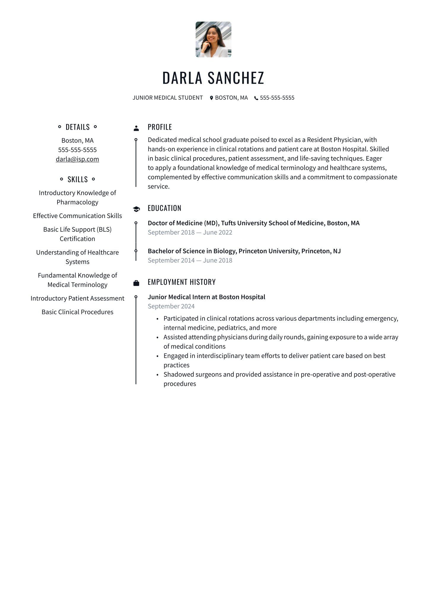 • Clinical Experience: List your core rotations, elective rotations, and any hands-on patient care experience, specifying the duration and your responsibilities.